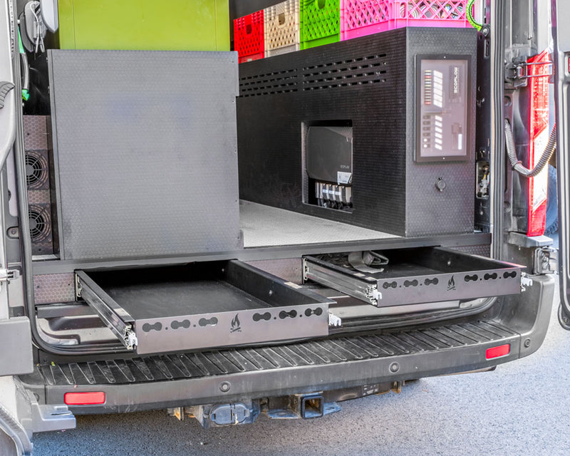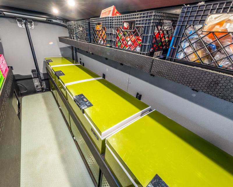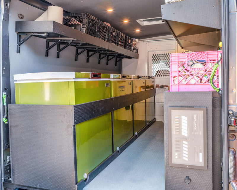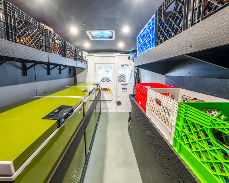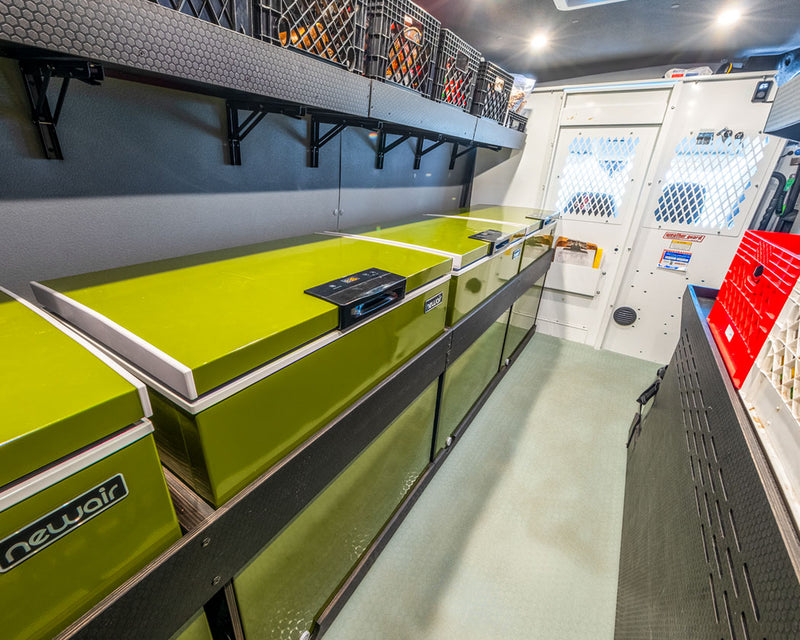 To solve these problems we created this beautifully efficient and user-friendly conversion with full size chest fridges/freezers, improved shelving, and a full off-grid electrical system. This setup allows them to bring food to far flung communities throughout the Olympic Peninsula, all without having to fuss with ice or worry about losing power throughout the day. A few key features of this build include: